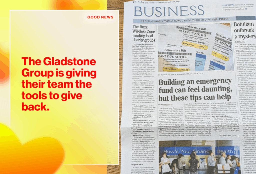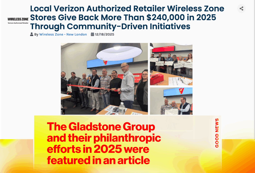 The Gladstone Group had an article written about them in Southeastern Connecticut newspaper The Day. This article focused on their charitable donations and the launch of 1K for Good, their giving initiative that is designed to empower employees to make a meaningful impact in their community. In recognition of their charitable efforts, the Gladstone group received $80,000 in grant funds from Wireless Zone Gives, and instead of keeping these funds centrally managed, they are letting each employee donate $1,000 to an organization of their choice.
